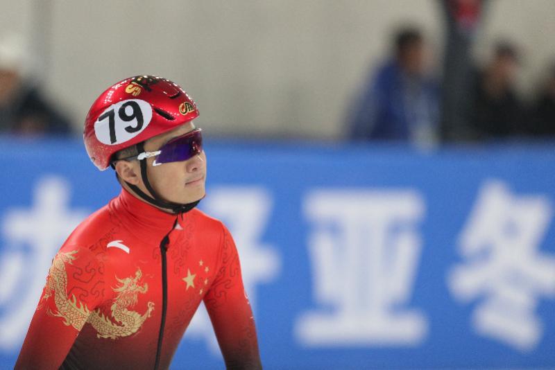 2024年11月14日,中国杯短道速滑精英联赛(第五站)在黑龙江省冰上训练中心开赛。任子威参加甲组男子1500米四分之一决赛前入场。新华社记者 张涛 摄