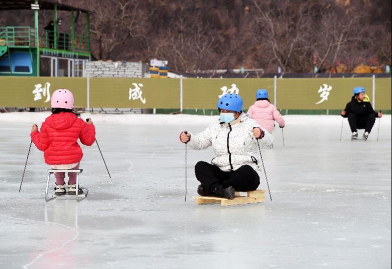 1月28日,在北京市平谷区镇罗营镇湖畔耕读园,游客在活动现场滑冰车。 新华社记者 任超 摄